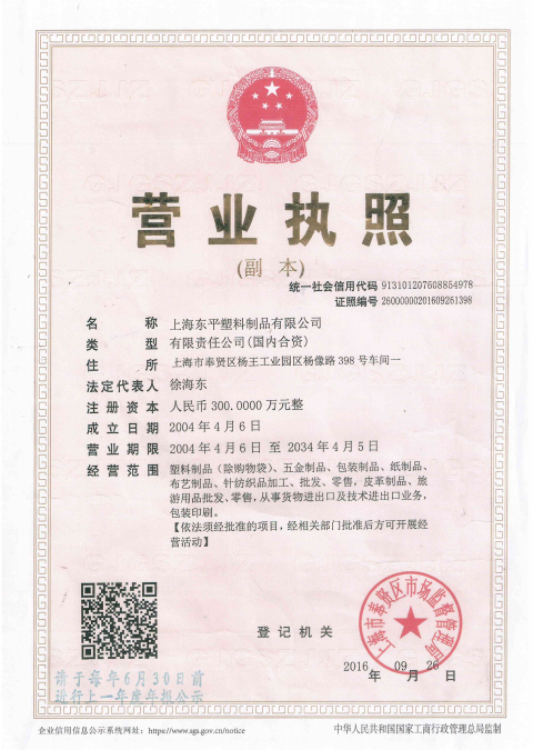 短短的五年间,公司已发展成为拥有员工200余名,其中各类管理人员25余名,技术开发人员5余名的集研发、生产、贸易为一体的集团性公司;新落成不久的国际标准化厂房,占地面积约为18000平方米,内设人力资源部、行政部、财务部、生产制造部、质量技术部、国内外采购部及市场营销部等职能部门;同时,公司还拥有吹塑机、吸塑机、挤塑机、液压四柱平面下料机、制袋机、高周波溶接机、封口机、缝纫机等固定资产总计一千万人民币的各类专业机器设备,无论从硬件还是软件方面,都为公司以强劲的势头,走可持续发展的道路夯实了坚实的基础。